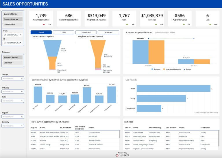 - Ingresos frente a previsiones, combinando los datos financieros con las previsiones u objetivos.