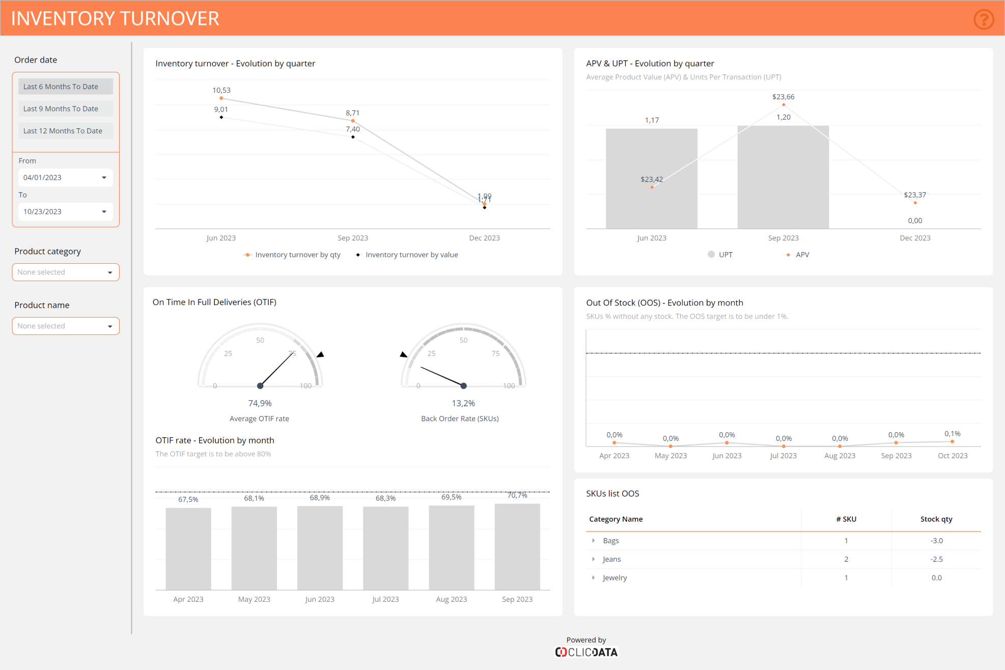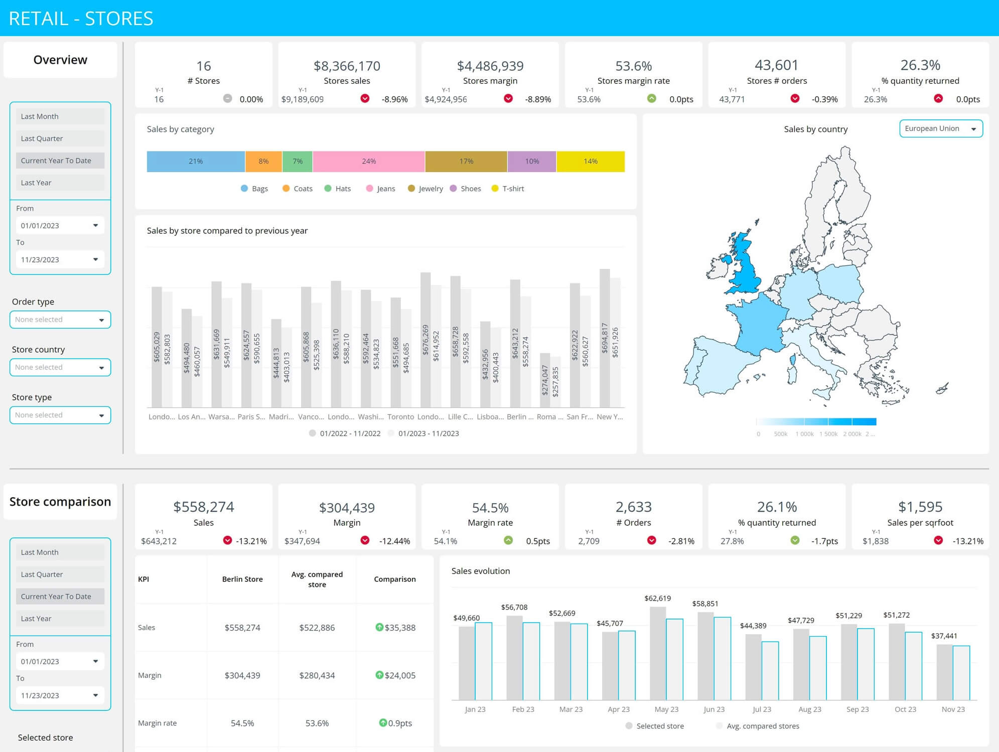 Quickly assess your product performance and monitor your top revenue-generating products across categories and regions. Track key metrics like your sales value, margin rate, orders/returns ratio, and more with this dashboard template.