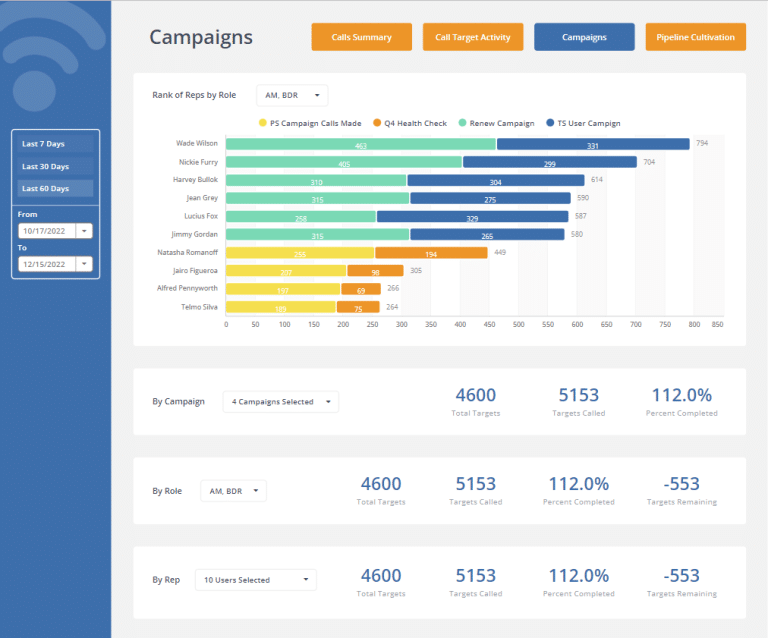 - Tieni traccia della produttività del tuo team di vendita: Chiamate, email in uscita, trattative in corso/chiuse, completamento di attività.